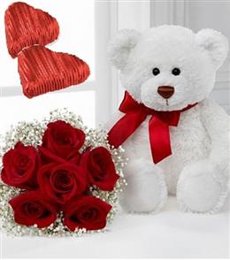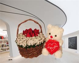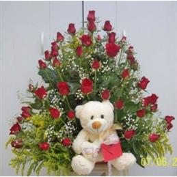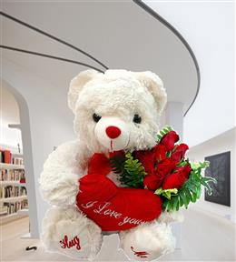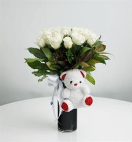 Vazoda 21 Adet Beyaz Gül ve Küçük Peluş Ayıcık